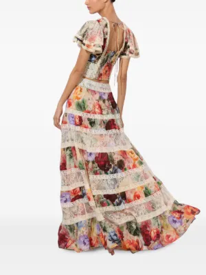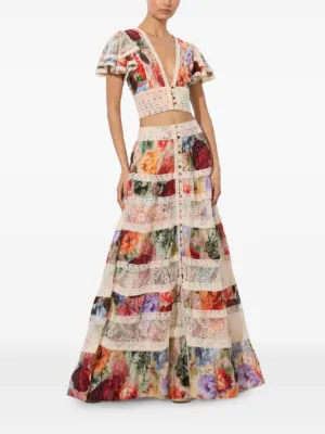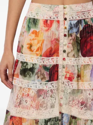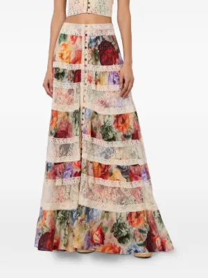 Final Sale alice + olivia Adira tiered maxi skirt Imported Highlights multicolour floral print pleated panels lace inserts button front fastening Composition Cotton 100% Washing instructions Dry Clean Only Product IDs FARFETCH ID: 30726436 Brand style ID: CC506P27304