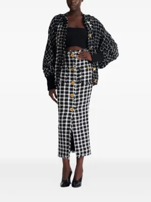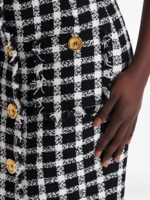 New Season Balmain tweed buttoned skirt Imported Highlights black gingham pattern tweed texture gold-tone buttons fringed trims Composition Cotton 83%, Polyamide 17% Washing instructions Specialist Cleaning Product IDs FARFETCH ID: 32570704 Brand style ID: GF1LE690CG47