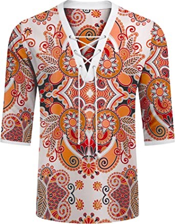 LecGee Men's Casual Cotton Linen Shirt Short Sleeve V Neck Tie Hippie Beach Tee Yoga Summer Top