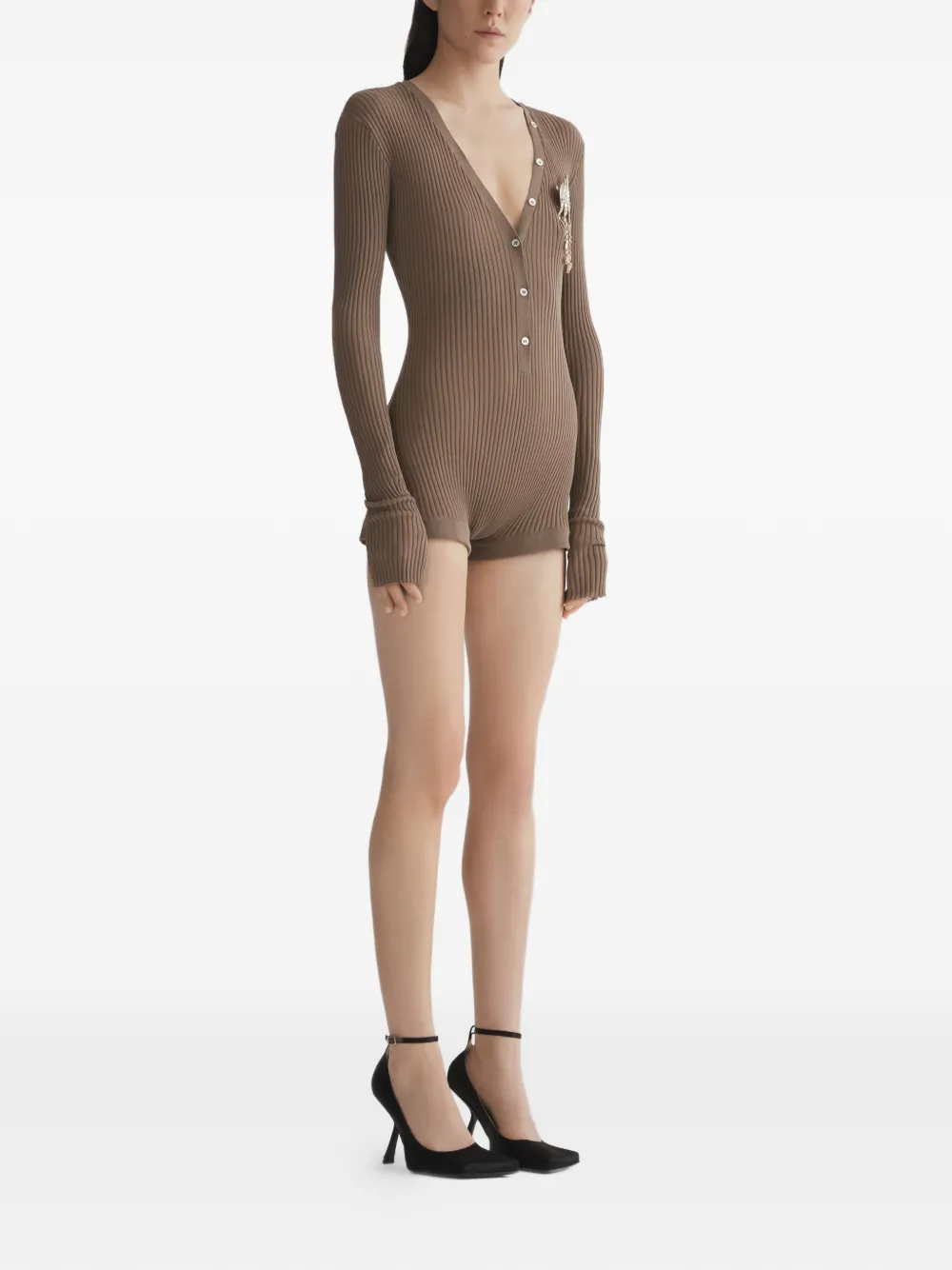 New Season Mugler button top Imported Highlights brown fitted bodysuit fine knit v-neckline extended buttoning ribbed trims Just a reminder that this piece must be tried on over your own garments. Composition Fabric 100% Washing instructions Read Manufacturer Guidelines Product IDs FARFETCH ID: 32399649 Brand style ID: 26P2BO02901136