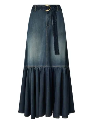 New Season PINKO ruffled midi skirt Imported Highlights dark blue belted belt loops ruffle hem back pockets panelled construction Composition Lyocell 60%, Cotton 40% Washing instructions Read Manufacturer Guidelines Product IDs FARFETCH ID: 32886786 Brand style ID: 106595A37K