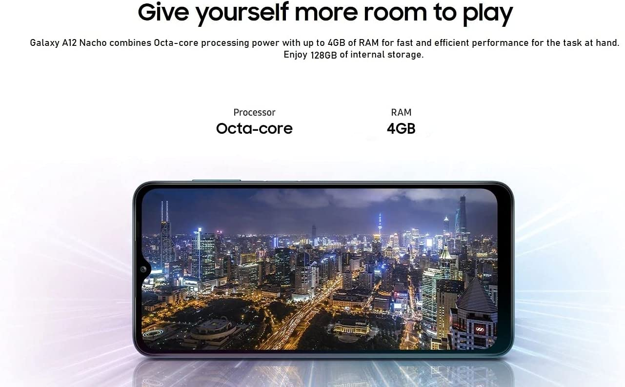 More display means more gaming space: Expand your view to the Galaxy A12 Nacho's 6.5-inch Infinity V display and see what you're missing. With HD+ technology, your everyday content looks crisp, clear and crisp. Upgrade your mobile photography with quad cameras: Capture memorable moments in crisp detail with the 48MP main camera. Expand your viewing angle with the ultra-wide camera. Customize focus with the depth camera, or get closer to the details with the macro camera. Keeps you going: Stay ahead of the day with a battery that won't slow you down. The 5,000mAh (typical) battery keeps you doing your thing for hours on end. With adaptive fast charging up to 15W, the Galaxy A12 Nacho quickly returns to full power. Give yourself more room to play games: The Galaxy A12 Nacho combines Octa-core processing power with up to 4GB of RAM for fast, efficient task performance. Enjoy 128GB of internal storage.