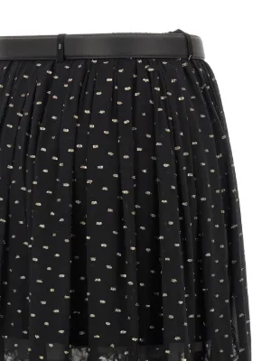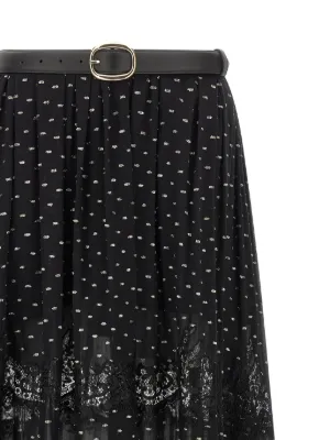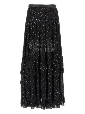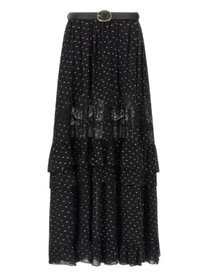 New Season Self-Portrait chiffon lace maxi skirt Imported Highlights black metallic fil coupé lace insert elastic waistband flared-flounces belt Composition Viscose 99%, Metal 1% Washing instructions Read Manufacturer Guidelines Product IDs FARFETCH ID: 33080214 Brand style ID: RS26196XSK