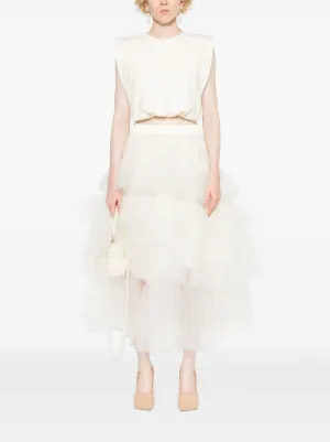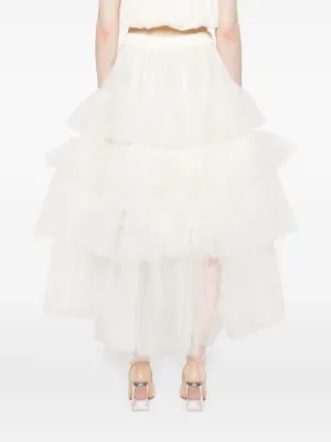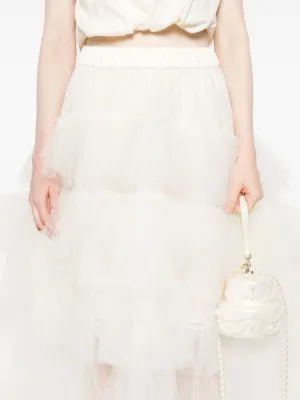 Simone Rocha tulle midi skirt Imported Highlights white tulle overlay fully ruffled elasticated waistband flared hem full lining Composition Outer: Polyamide 100%, Nylon 100%, Acetate 73%, Silk 27% Lining: Acetate 60%, Cupro 40% Washing instructions Dry Clean Only Wearing The model is 5 ft 10 in wearing size 8 Product IDs FARFETCH ID: 23444057 Brand style ID: 31250035IVORY